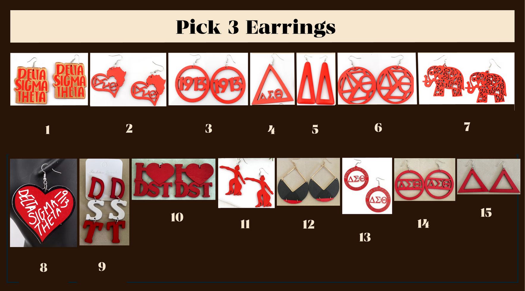 You also may also select 3 pairs of wooden earrings with various symbols to display your pride in sisterhood.